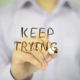 Man, Businessman, entrepreneur, stock trader, analyst or banker writes on transparent wall : Keep Trying