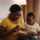 Kids Development. Caring Black Mother Teaching Little Son Reading At Home While Sitting In Chair With Book Together, African American Mom Spending Time With Her With Preschooler Male Kid, Slow Motion