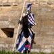 French Knight at the walls of the old impregnable fortress. Knight dressed in full combat attire, he goes into battle. There is a jousting tournament, where are the best soldiers from around the world, and he is waiting for his turn to speak.