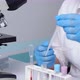 Skilled lab assistant in blue gloves drips transparent liquid on slide working at table with modern microscope in clinic close view