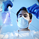 A scientist is transferring liquid with a pipette. Laboratory Interior, view from below.