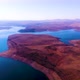 A drone aerial shot of a lake and forest hill in a countryside.