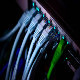 Working Ethernet switch close up technology clip. LED blinking lights, UTP cables, 10/100/1000 TPorts. Operational status.