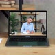 Laptop computer standing on table working office business workplace, display with businessman top manager sitting on chair in home office wears wireless earphones writes information in notebook
