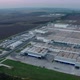 Large industrial complex. Exterior of production plant on field. Grey manufacturing with car parking. Motion camera to the left. Aerial view.