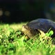 a large turtle is examining the territory and crawling over the grass in the summer. Close-up