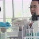 Scientist observing behavior experiment animals with little girl in lab. Rats were used in laboratory. Concept of science, testing development and lab industry.