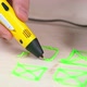 Close-up of male hands trying to draw with 3D printing pen heating green plastic