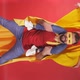 Let’s fly. Funny kid girl and man pretend to be superheroes, male hold little girl on neck, ready to save the planet.