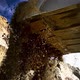 Loader machine unloading sand at eathmoving works at the construction site. Stock footage. Bottom view of the excavator flipping the bucket with soil and sand