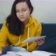 A woman with a tablet. A female student uses the Internet for distance education. Lockdown. Remote work at home.