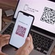 Log In Web Page Using Smartphone with QR Code Scanning Application. Authorization or Autentification with Bar Code Reader. Synchronously Successful Approval on Laptop and Mobile Phone. CloseUp VIew.