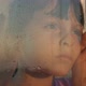 Look through the wet window. Unhappy kid with interest looks at the rain by the window.