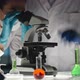 Close-up shot of woman using microscope for scientific research at the table in laboratory