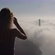 The attractive young woman is standing on a high hill with a view on a San Francisco in the fog. She is confident about her future and getting new energy for building her startup.