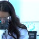 Scientist female is looking through microscope with colleagues working in modern laboratory or medical center. Concept of science, testing development and lab industry.