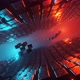 Loop seamless motion abstract tunnel between two wave bending planes of reflective cube blocks in neon red cyan color light. 4k graphic
