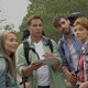 Pan of disoriented trekkers standing in the middle of the woods and studying map