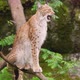 Handheld shot of lynx yawning while looking away. Carnivore animal is sitting on tree. It is in wilderness area.