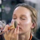Make-up artist doing make-up accents using shiny shadows. Putting on the face, nose using fingers and a brush. Make up studio. Close up.