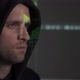Male hacker working on a computer while green code characters reflect on his face in a dark office room