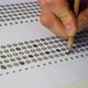 Male student hand testing doing examination test with anger. Standardized test form and answers bubbled. Student filling out answers.