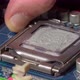Assembling high performance personal computer, inserting hardware into the motherboard socket, opened PC case in background, shallow depth of field