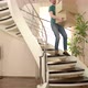 Man carrying stack of boxes. Young male walking downstairs. Common moving problems.