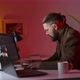 Caucasian male developer using laptop and pc for coding late at home. Bearded man sitting at living room with dark atmosphere and programming.