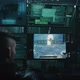 Male programmer using computer to control space unit and station coupling process while sitting at table in dark room. Footage furnished by NASA. Full HD version