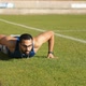 Strong attractive man doing pushups as working out in large green pitch, concept of active lifestyle