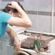 man fixes washing machine, repairs, broken, destroyed. Bathroom, tools, repair man. Pondered, sighs, sad, doesn’t understand, difficult repairs