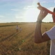 Father flies toy red plane towards small sons standing on boundless mown yellow field in summer against blue sky at back sunset light closeup