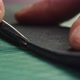 Man hands cutting thin line on black leather with sharp knife close-up. Craftsman carving skin material on workplace table, making handmade products made of genuine or artificial leather.
