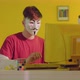 Man in hacker mask is working on retro computer in yellow office, trying to steal some data, looking at camera confidently, Foreground, Slow motion.