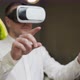 Young man enjoys virtual reality technology sitting in office premise. Focused player in white shirt with goggles tries to play game moving hands closeup