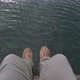 Man is resting on beach. View of feet in suede sports shoes over the surface of the sea. Outdoor recreation.