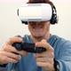 Man playing joystick game with virtual reality headset on sofa against white background 4k