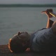 a man lies on the bank of a pond in the evening and plays a musical instrument