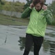 Tilt up of man putting headphones while running through puddles in the park. Slow motion footage
