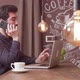 Man talks on the smartphone while working at a bar counter. Bearded man having a phone conversation.