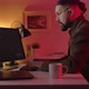 Caucasian man in eyeglasses and casual wear sitting at workplace and writing code on two modern computers. Concept of programming, technology and IT sphere.