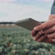 Close-up shot footage of unrecognizable farm worker walking along field counting quantity of rows using digital tablet