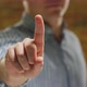 Front view close up of a young Caucasian man wearing a shirt with arm raised and hand out in front of him, with finger facing camera, touching