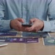 Front view mid section of a young Caucasian man sitting at a table using a smartphone, with paperwork, a laptop computer and a takeaway coffee on the table