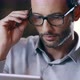 Man using tablet technology.Corporate business team work office meeting.Three businessman and businesswoman people group talking strategy together.Collaboration,growing,success detail.4k video.