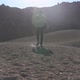 Wide Slow Motion Tracking Shot Of Man Walking Through Moon Like Location Of Stones And Gravel Towards Lens Flare Of Sun, Tenerife