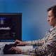 Short-haired brunet man in checkered shirt wins videogame and rejoices actively gesticulating with fists sitting on gaming chair at computer screen.
