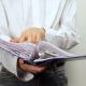 Video of a young man, obviously business man, student or teacher on white background holding an office folder with documents in his hands and turning pages while reading it. This could be a good addition to a commercial, business video presentation, tv program etc. Filmed using Canon 60D