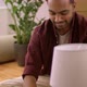moving, people and real estate concept – happy indian man with boxes and blueprint at new home